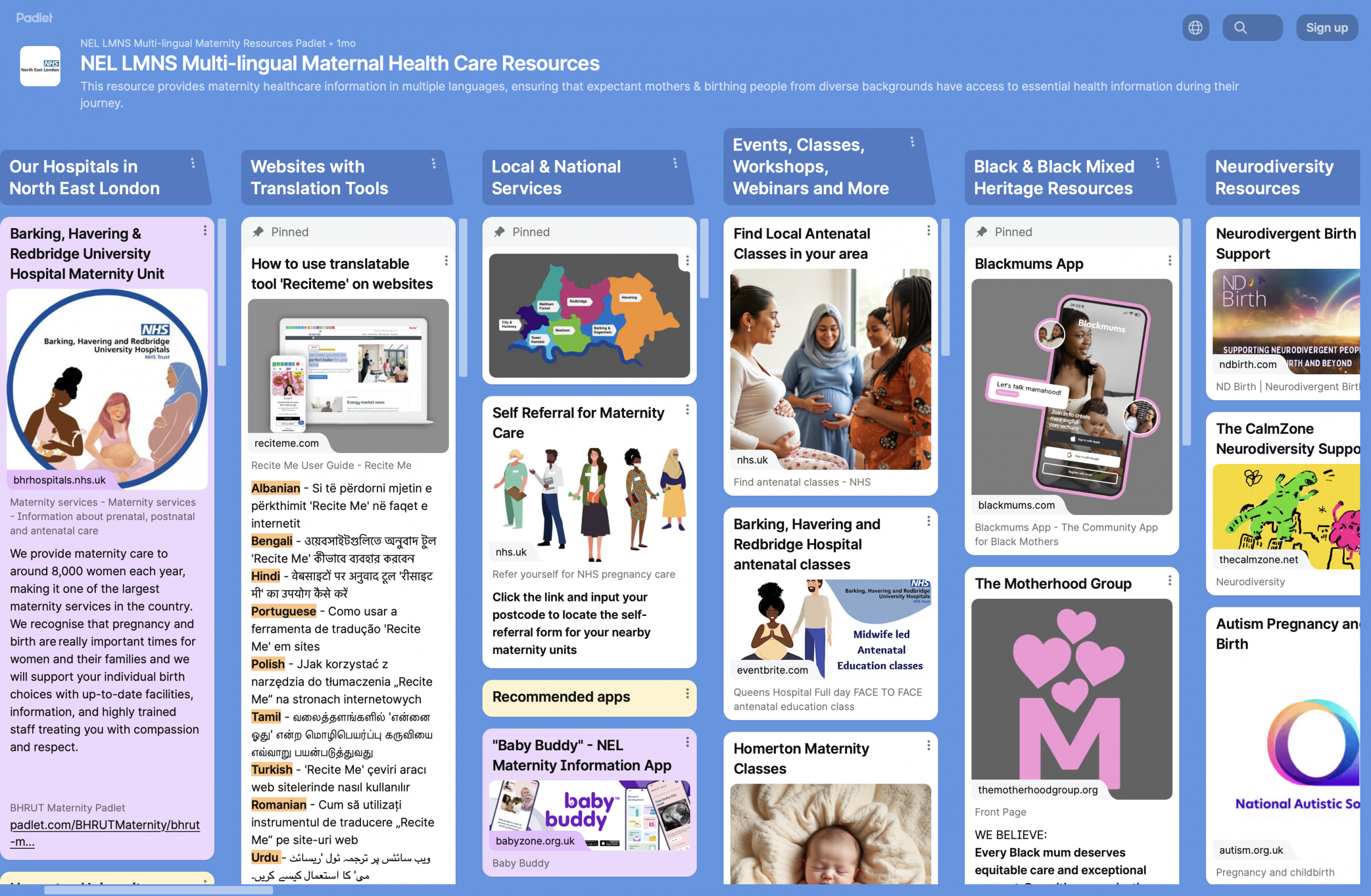 All resources are organised in one easy to use Padlet so you can quickly find what you need, whether it is a guide in your language, an antenatal class, a support app, or advice for neurodivergent and LGBTQ+ parents. The Padlet is fully interactive and regularly updated, making it simple to explore local and national maternity resources in one place.